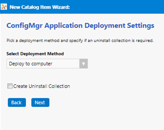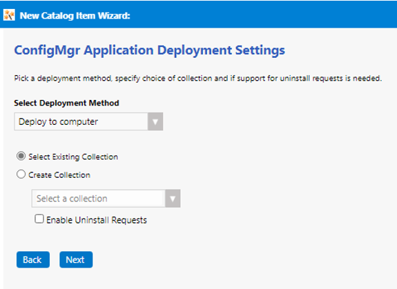 • Application—The ConfigMgr Deployment Settings panel opens when Enable selection of existing collection when creating/editing a catalog disabled.