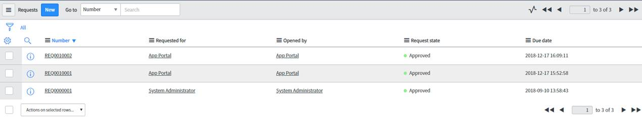 - This displays all the requests placed for App Portal catalog items via ServiceNow. Their status can be seen under the Request state. column.