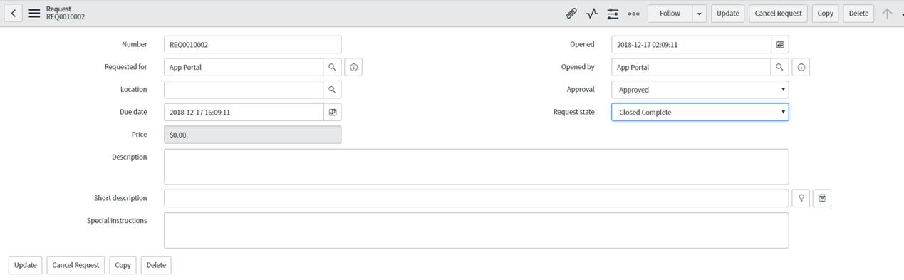 - Clicking one of the requests (REQ0010002) displays the request details. If the status is Success in App Portal, the Request State displays as Closed Complete.
