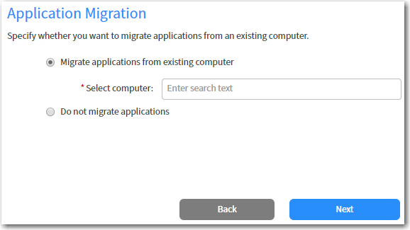 - If you want to migrate applications from an existing computer to the target computer, select the Migrate applications from existing computer option. If you select this option, the Select computer field is displayed, where you are prompted to search for the existing computer.