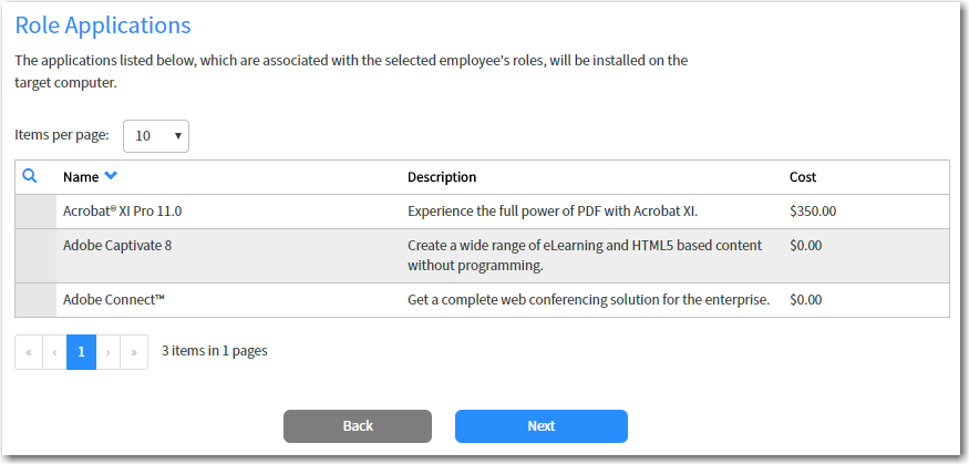 From the Task sequence list, select the task sequence corresponding to the action you want to take, and then click Next. The Role Applications panel opens, listing the applications that are associated with the selected employee’s roles, which will be installed on the target computer.