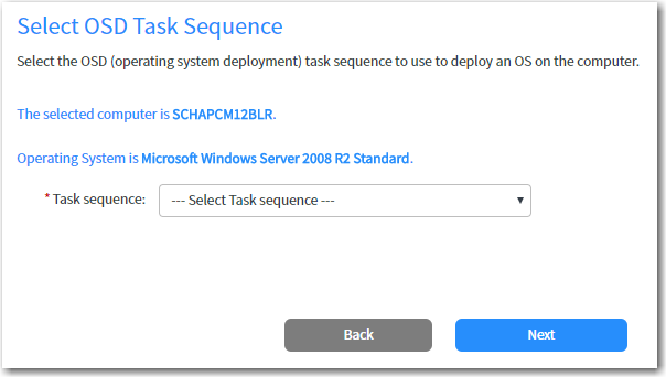 After you select a computer to update, click Next. The Select OSD Task Sequence or Select Non-OSD Task Sequence panel opens, listing the name of the selected computer and its current operating system.