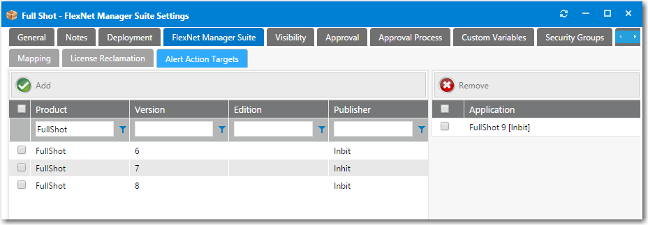 - Use the filter fields in the columns to search the FlexNet Manager Suite database for the application(s) that you want to target.