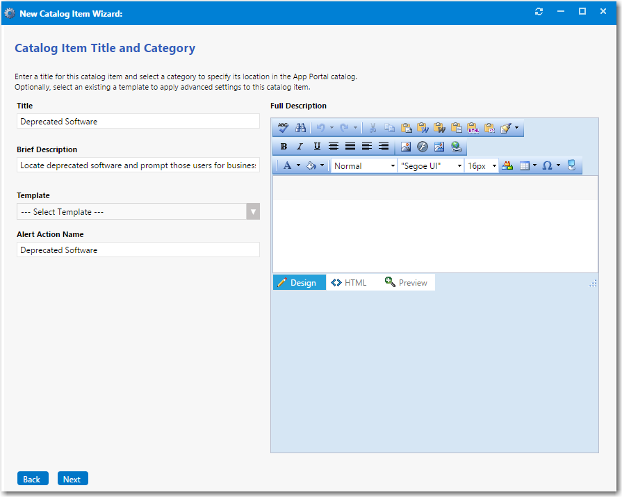Select Alert Action Catalog Item and click Next. The Catalog Item Title and Category panel opens.