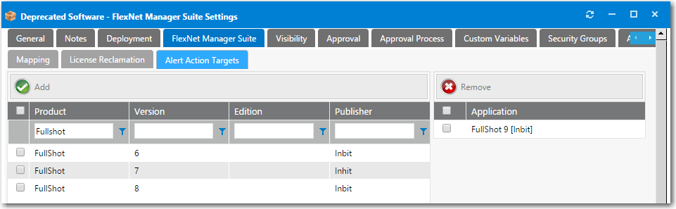 If you want to target this alert to owners of a specific application, open the FlexNet Manager Suite > Alert Action Targets tab and perform the following steps: