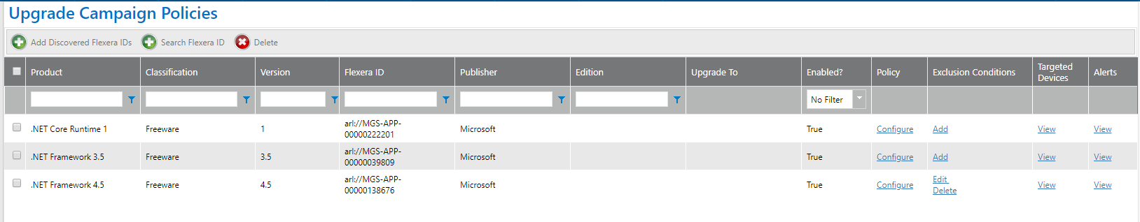 To upgrade an application installed in your enterprise—To create a campaign to upgrade an application that is installed in your enterprise, click Add Discovered Flexera IDs. The Add FlexeraID From Applications Discovered in FNMS view opens, listing all of the applications that have been discovered by FlexNet Manager Suite as being installed in your enterprise.