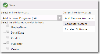 - In the Select an inventory class list, select a new class, such as Add Remove Programs (64). Attributes of that class are listed.