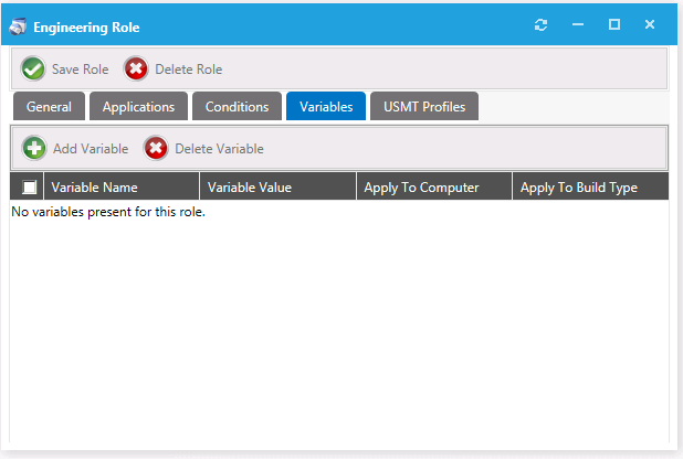 On the Variables tab of the Role Properties dialog box, you can specify variables that can be used by the task sequence process that delivers the applications specified in this role.