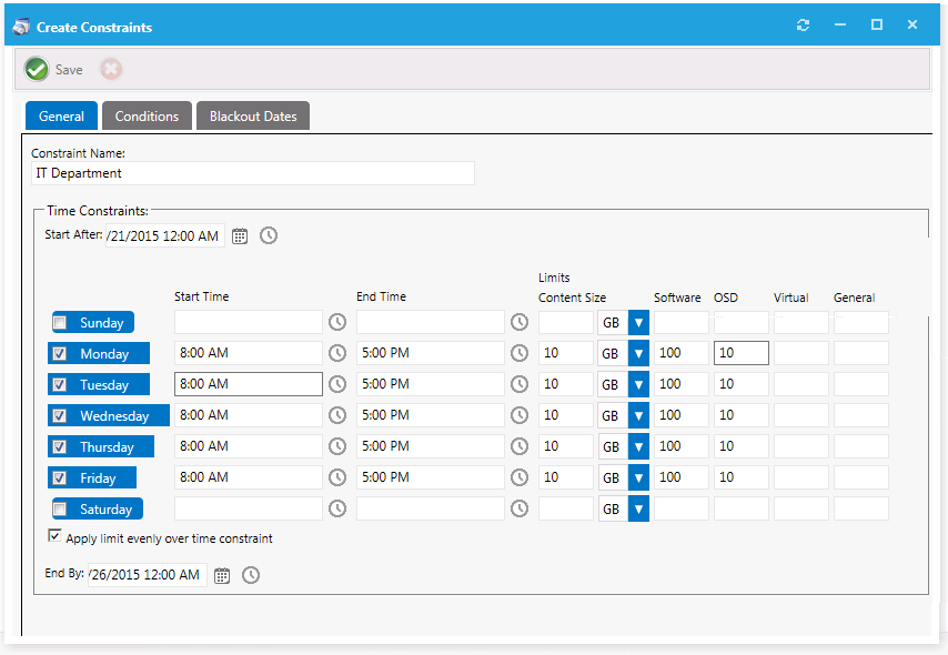 Property Description Constraint Name Enter a name to identify the constraint. Start After / End By Use to set the time range for the selected days that are available for the schedule. Start After —Opening date of deployment, End By —Date when the deployment will no longer be available Start Time / End Time To limit installation to a specific time range for a day of the week, specify the Start TimeandEnd Timefor that day. If no start or end time is specified, then any time is available. In this example, the requester would only be able to select a time range for installation between 8:00 a.m. and 5:00 p.m. on Monday through Friday. Saturday and Sunday would have any time available.Limits Content Size To limit the scheduling based on the total content size for items being delivered for others that meet the same constraint, enter a limit (in KB, MB, or GB). This limit is calculated by totaling the SCCM package size for the requested items for that day. In this example, if 10 users scheduled Microsoft Office (a 1 GB package) from the IT Department on Tuesday, the next user would hit the content size limit for that day and would not be able to schedule their installation for Tuesday. If the requester selects Wednesday, the same evaluation will occur for that day. Type Limits: Software, OSD, Virtual, and General Use to limit the volume of the specific class of catalog item (software, OS deployment, virtual package, or general) that can be requested. This allows you to limit by the type instead of limiting the time or data size. -