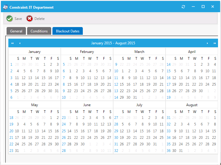 - Open the Blackout Dates tab. Use blackout dates to limit scheduling options such as holidays. The requester will not be able to select a date from the scheduler if it is blacked out.