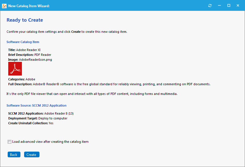 To add an uninstall collection to this catalog item, select the Create Uninstall Collection option. When this option is selected, users will be able to submit an uninstall request from App Portal, and System Center Configuration Manager will uninstall the application. App Portal will inform the user when the uninstall is complete.