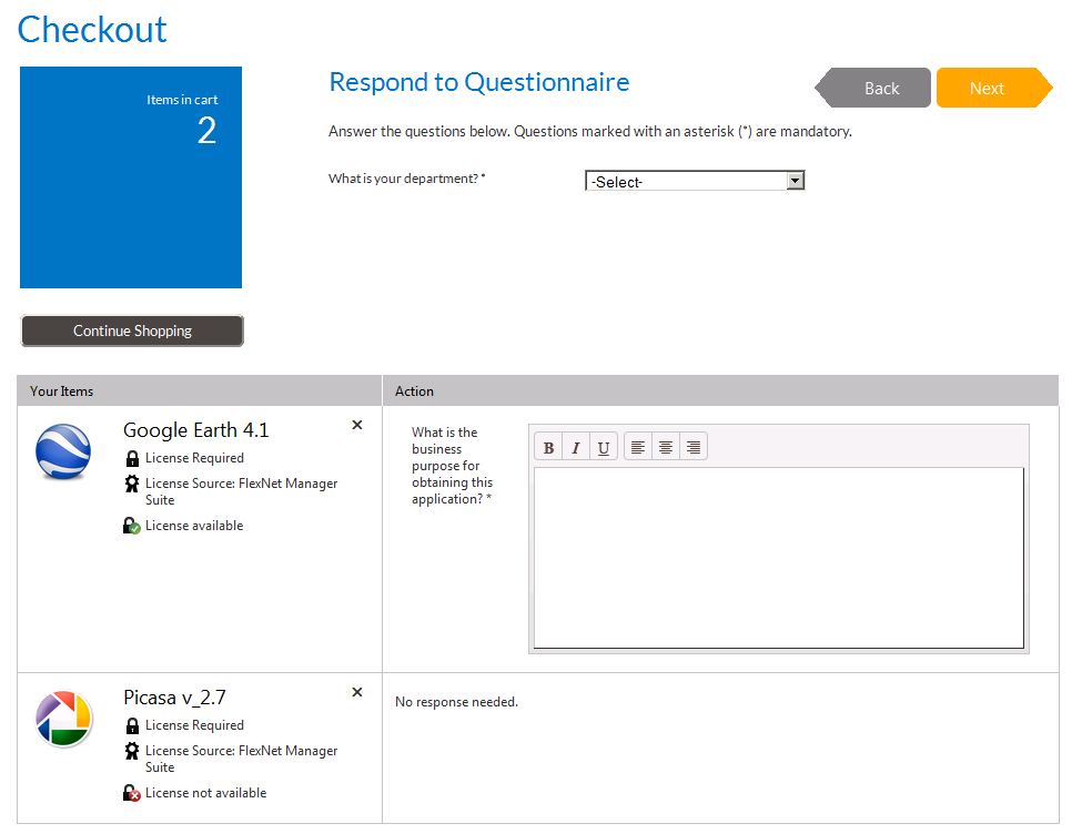 Specify the target location for these catalog items, and then click Next. The Respond to Questionnaire pane l opens.