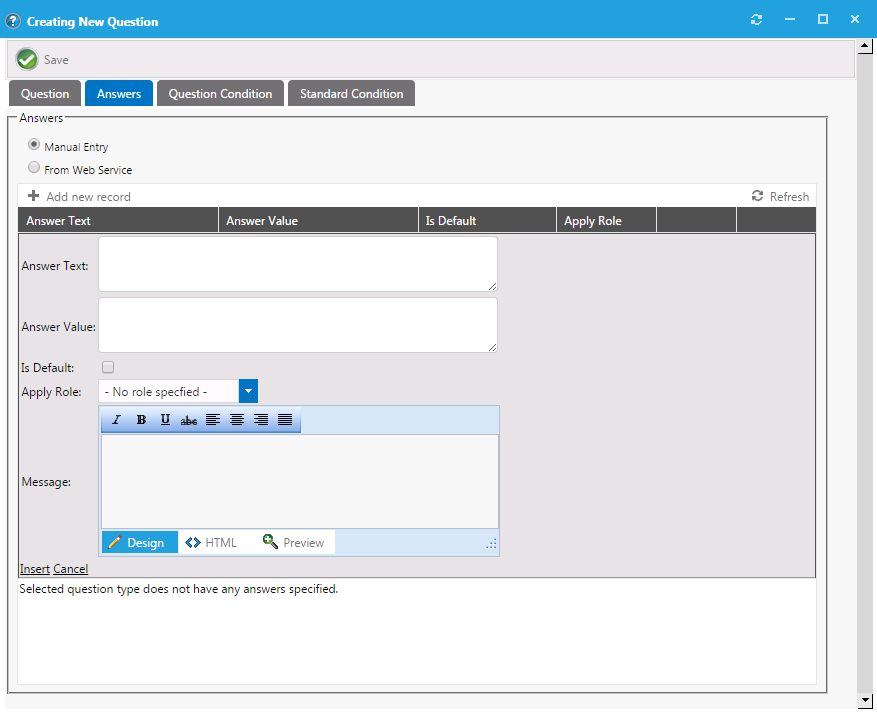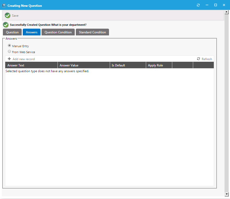 - Click Save. You are notified that the question was created successfully, and, because you selected Dropdown List as the question format, the Answers tab is enabled, where you need to enter the values for the list.