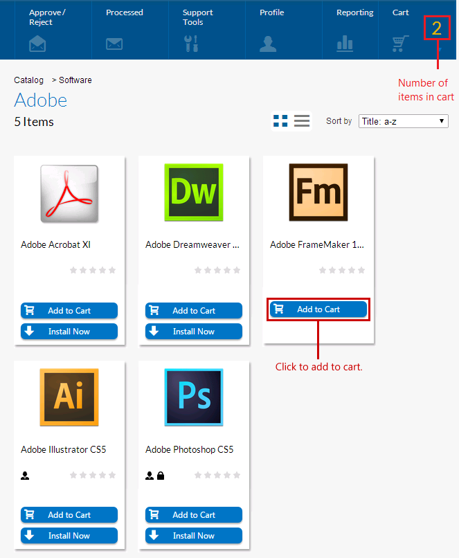 2. Once you locate the item, begin the checkout process by clicking the Add to Cart button in the catalog item card. When an item is added to the shopping cart, the cart count will increase.