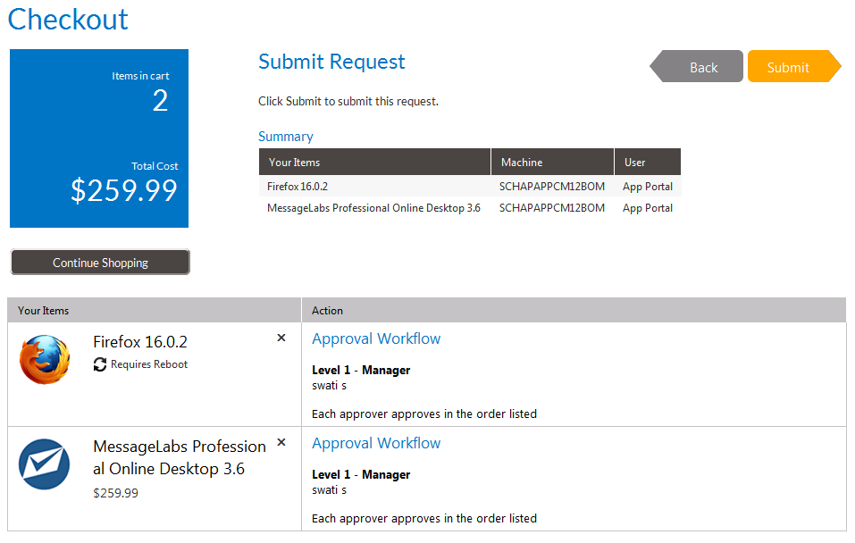 The Submit Request panel is the final step in the request process. It summarizes the items being requested and the targets of the request. If approvals are required, it lists approval information.