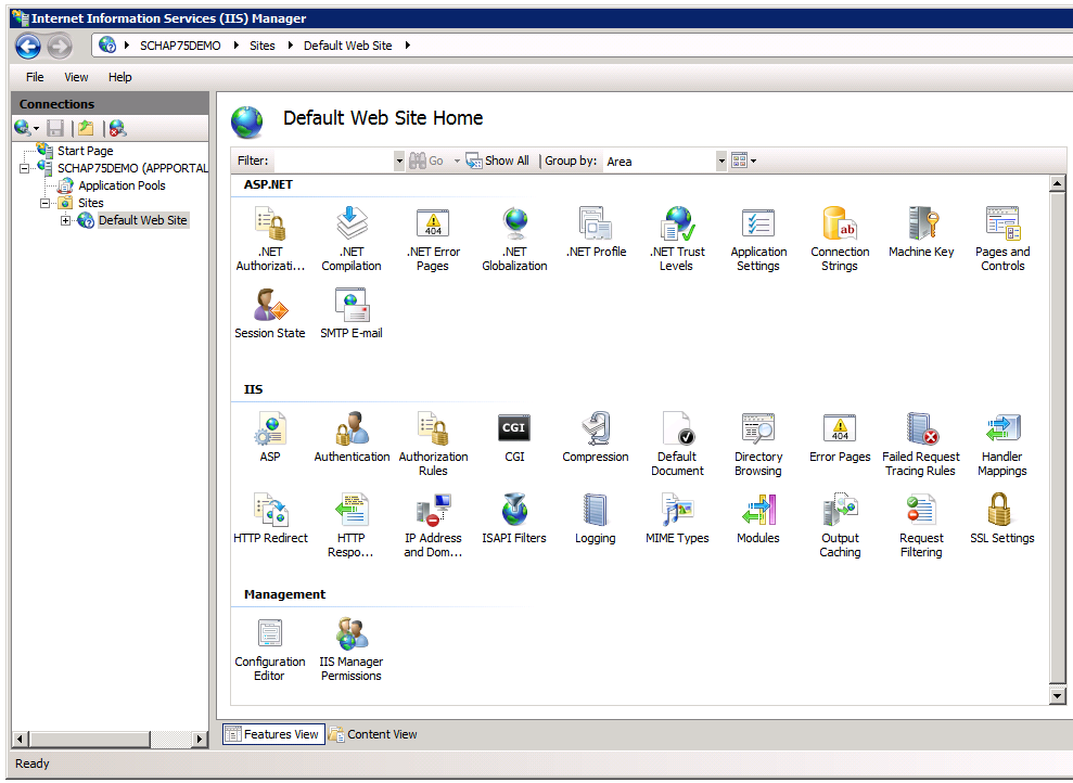Select Default Web Site in the tree. The Default Web Site Home view opens.
