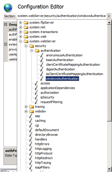 From the Section list, expand the tree and select windowsAuthentication (which is under system.webServer > security > authentication).